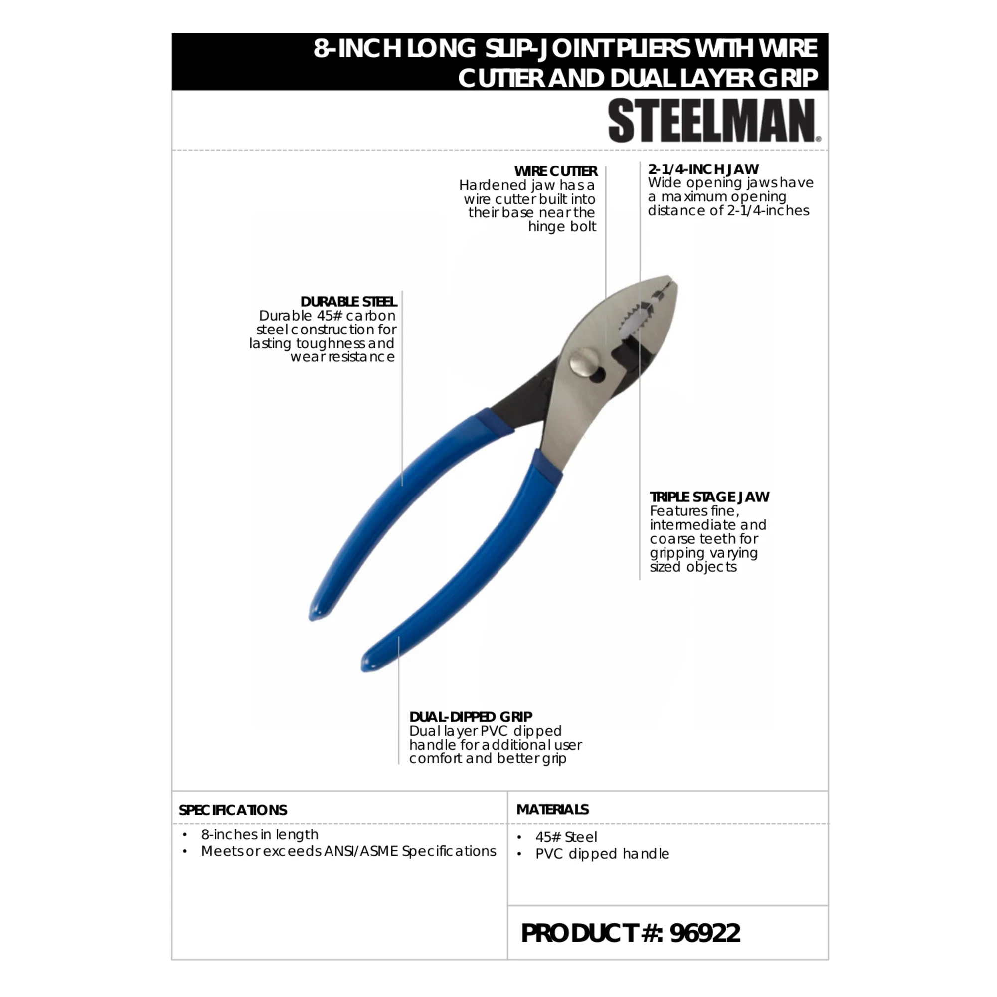 Grip large, small and everything in between with a pair of STEELMAN 96922 8-Inch Long Slip-Joint Pliers with Wire Cutter and Dual Layer Grip. These hard working pliers are forged from hardened 45# carbon steel for lasting toughness and wear resistance to enable them to grip snugly onto the hardest materials with less jaw deformation. The multi-machined jaws feature three different tooth sizes: a fine tooth pattern near the top, larger intermediate teeth in the middle of the jaws, and a coarse tooth pattern to provide you the gripping power you need to securely hold both large, medium and small objects. At the base of the jaws, next to the joint, is a shearing style wire cutter for clipping bundle wires and similar bands or for shearing insulated and non-insulated copper wires.. With the slip-joint, the jaws can be opened up to 2-1/4-inches wide to grab onto large hoses and nuts as easily as smaller fasteners without sacrificing closing strength or forcing you to hold the tool awkwardly. The handles are dipped in two layers of soft black plastisol / PVC for added hand comfort and grip. When you need to reach in and grab hold, reach for STEELMAN.