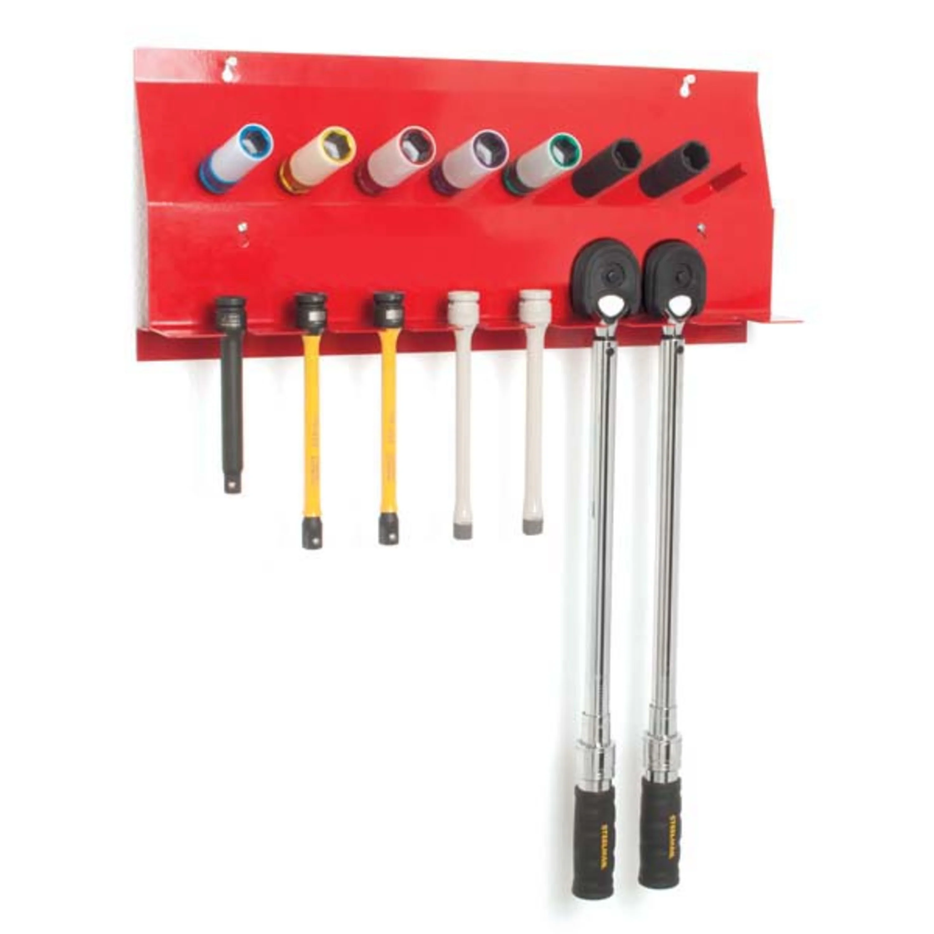 Organize your torque tools in one convenient location with the STEELMAN 50010 8-Slot, 8-Peg Wall Mounted Storage Bracket. This easy to mount tool holder measures 21.75-inches wide and has pre-drilled mounting holes spaced 16-inches apart for easy attachment to a range of surfaces from walls to lift posts and tool carts with included hardware. 8 tool hangers provide storage for ratchets / torque wrenches, extension bars, torque sticks, and other tools while the 8 pegs are ideal for storing often used sockets. Constructed of durable 16-gauge sheet metal that can stand up to long use without aging or becoming brittle like plastic and its bright red powder coat is easy to clean while resisting chipping and fading.